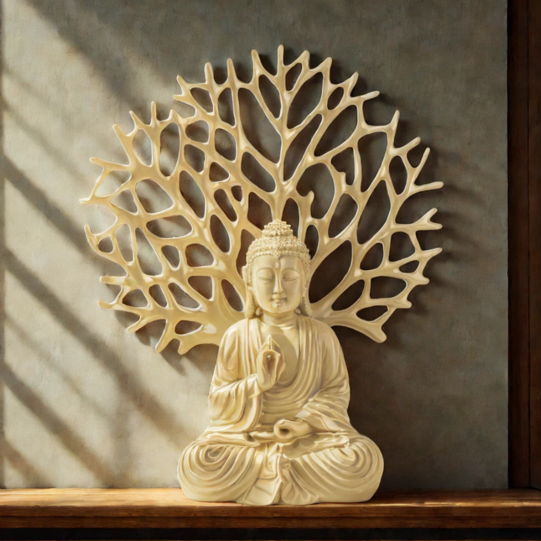 Ashnam Blessing Buddha with Tree Decorative Showpiece – 31.3 Cm, Cream Orange