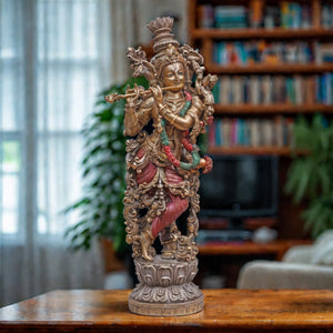 Krishna's gentle smile and melodious flute-playing evoke a sense of transcendence and inner peace. Whether displayed as a focal point in your home or incorporated into your spiritual practices, this figurine serves as a reminder of divine love and harmony. Perfect for devotees of Krishna or admirers of Hindu art, our Krishna Playing Flute Figurine radiates timeless beauty and spiritual grace.
