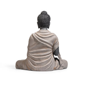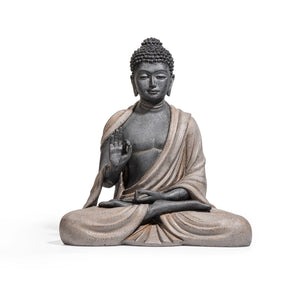 This particular statue is a statue of a seated Buddha whose right is raised in front of the chest and faced outwards away from the body. It has two common meanings. It is said that the raised right hand of Protection Buddha statue represents a shield overcoming fear. Courage protection from fear, delusion, and anger are some of the significance of Abhaya Mudra.