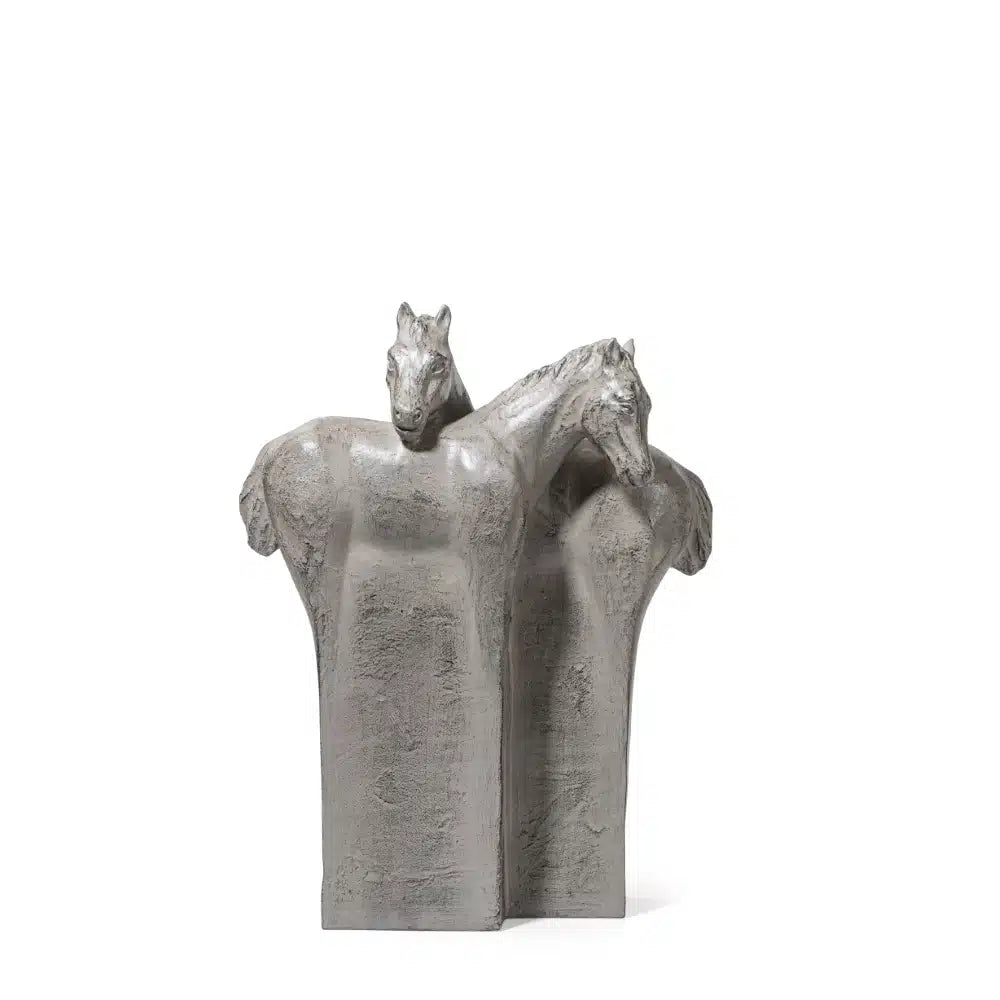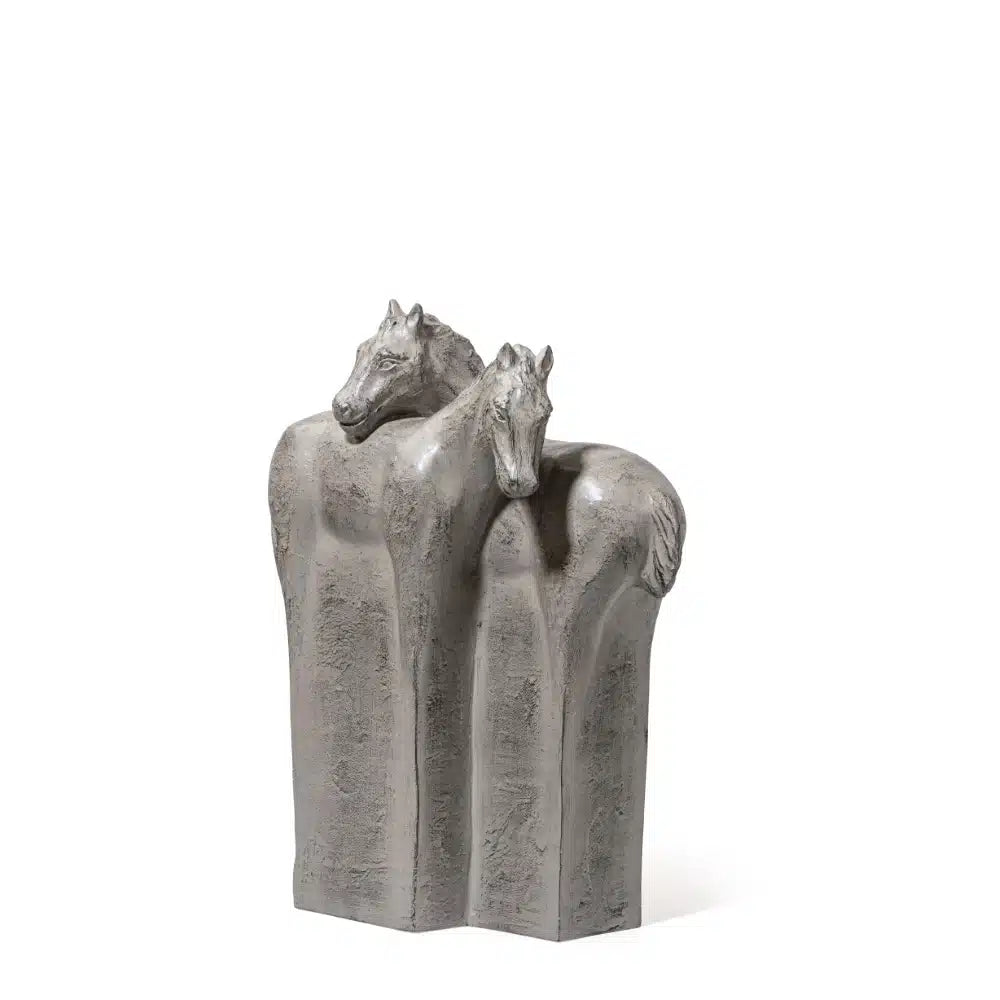 The abstract couple horse sculpture symbolises partnership and unity through its fluid design. The cement grey finish lends a contemporary touch, creating a statement piece with a meaningful narrative.