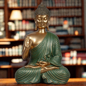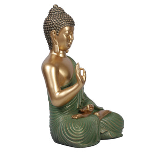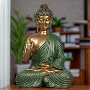 Ashnam Blessing Buddha Statue in Gyana Mudra With Hand Raised - Green Gold, 27 Cm
