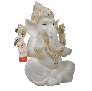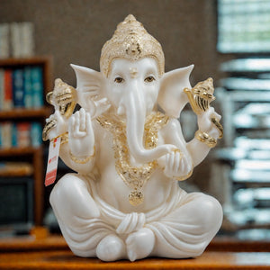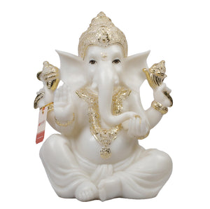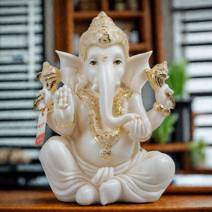 Evoke a sense of divine presence with our White and Gold Ganesh Murti, radiating with celestial grace and elegance. Crafted with exquisite detail and adorned with shimmering gold accents, this sacred sculpture captures the essence of Lord Ganesh's benevolence and wisdom. Whether placed in a meditation room, altar, or sacred space, it becomes a focal point of reverence and devotion. Embrace the divine energy of Lord Ganesh and elevate your spiritual journey with this exquisite murti.