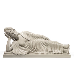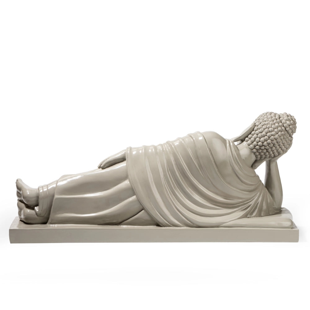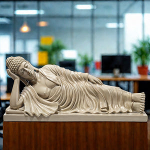 Reclining Buddha Statue is a representation of Buddha lying down at the time of his Mahaparinirvana. This particular statue represents the historical Shakyamuni Buddha during the last phase of his illness. The Reclining Buddha statue is seen lying on the right side that is facing west and the head rests on its right hand. The right hand is seen placed under the head or on the pillow.