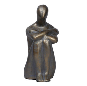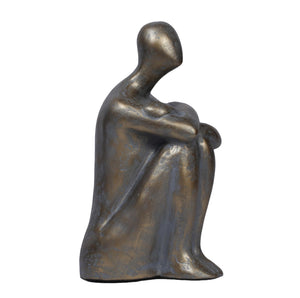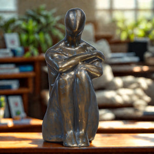 Elegance meets introspection in this 21 cm sculpture, featuring a seated figure in a reflective pose. The antique gold finish adds a modern touch to its abstract design, making it a versatile piece for any room. Whether placed on a shelf, console table, or desk, this sculpture enhances the space with its artistic charm. A perfect gift for art enthusiasts or a sophisticated addition to your decor.