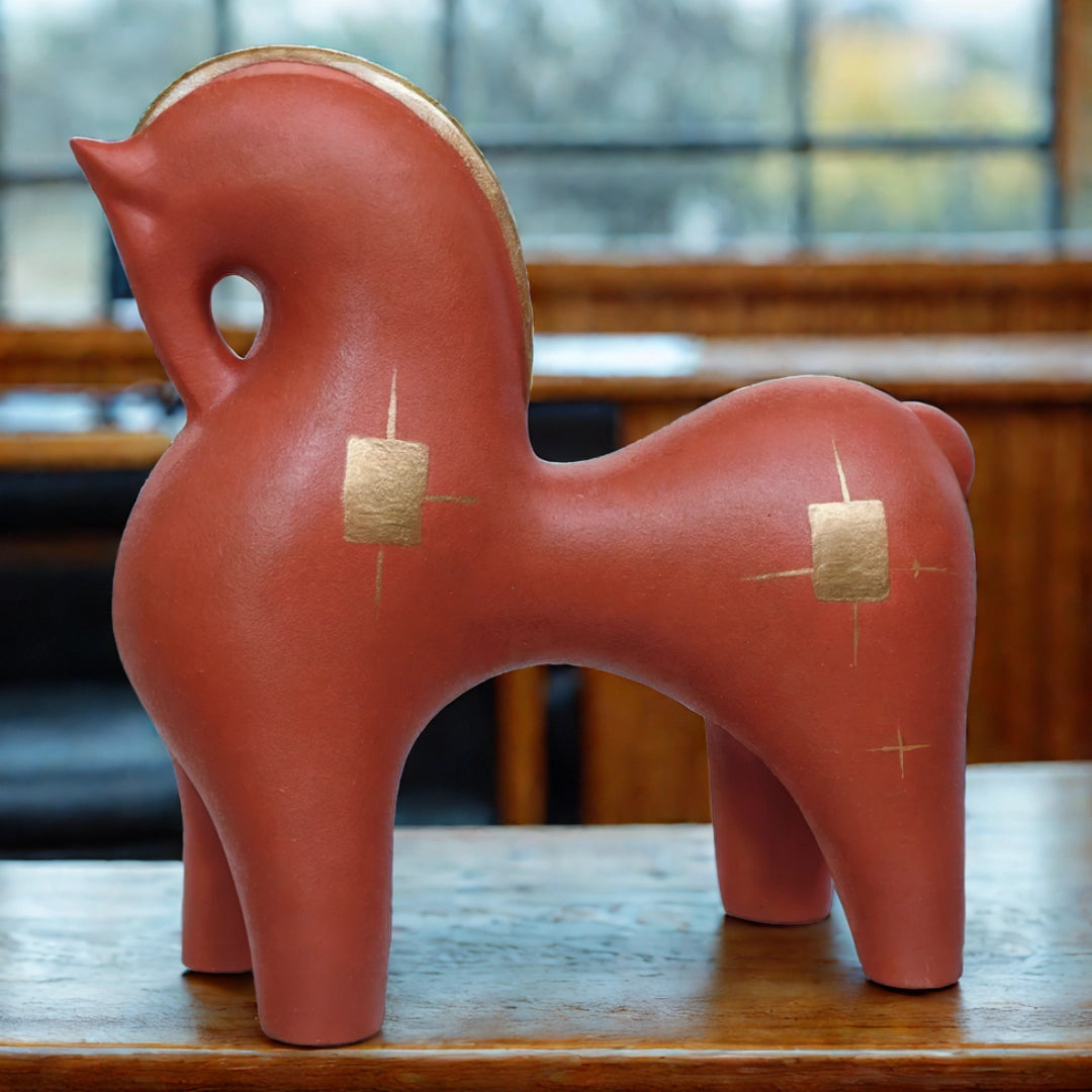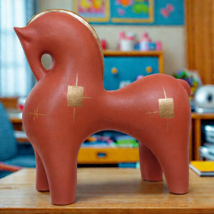 This horse sculpture celebrates grace and determination through its intricate detailing. The terracotta and gold tones create a classic yet contemporary aesthetic, perfectly suited for elegant home décor.